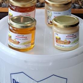 Unsere Bienen leben hier in unserer unmittelbaren Wohnnähe auf dem Garten in Erding im Ortsteil Williamsville. Unsere 4 Völker an diesem Standort haben im Sommer eine Bienenstärke von 160.000 Bienen und können sich in einer, durch den im Flugradius befindlichen Ackerländer, verschiedene Kleingartenanlagen und Grünanlagen, sehr abwechslungsreichen Umgebung bestens entwickeln. Das Trachtangebot für unsere Bienen reicht von den Kirsch- und Apfelbäumen des Williamsville im Frühjahr bis zu den Winter- und Silberlinden der großen Ackerländer in der näheren Umgebung im Spätsommer. Ergänzt wird dieses Angebot durch die Kastanienbäume, Akazien, Linden und Ahorn der Umgebung und Grünanlagen. Der Honig der Frühjahrsblüte ist meist cremig von einer hellen bis mittelbraunen Färbung, der Honig der Sommerblüte abhängig von der Blüte der Akazie, und Linde meist länger flüssig und von einem zarten gelb bis Braunton. Durch unsere Arbeitsweise und System ernten wir nur Honig aus unbebrüteten „jungfräulichen“ Waben der separaten Honigräume. Allen eingetragenen Honig im Brutraum belassen wir unseren Bienen zur Selbst- und Winterversorgung. Unsere Bienenköniginnen sind von der Rasse Buckfast und Carnica. Meine beiden Kinder mit 14J und 12J betreuen unsere Bienen, damit auch unsere jüngste Generation mit diesem aus unserer Sicht sehr wichtigen Thema vertraut wird.