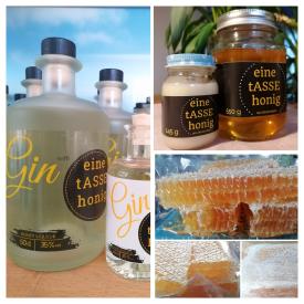 Als Besonderheit habe ich einen Ginlikör mit meinem eigenen Honig im Angebot (0.1L Flasche zum Probieren oder Verschenken, 0.5L Flasche für den Gin-Liebhaber), der in Zusammenarbeit mit einer kleinen Destillerie produziert wurde.
